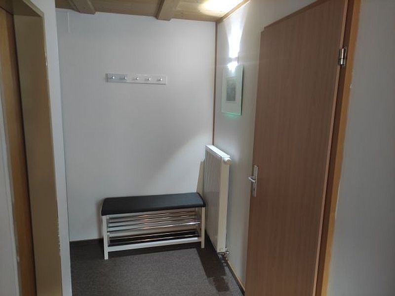 einen Eingangsbereich mit Garderobe und Schuhregal,
