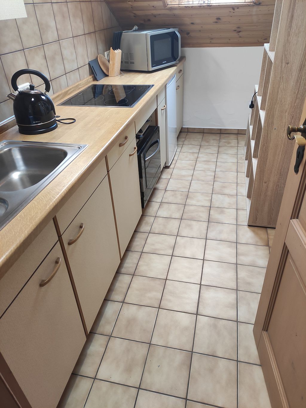 und eine Küche mit Küchenzeile, Ceranfeld, Heißluftofen, Kühlschrank, kleiner Spülmaschine, Toaster, Wasserkocher, Filterkaffeemaschine und Kaffeepad-Maschine. Die Küche ist mit Geschirr, Gläsern, Besteck, Kochutensilien, einigen Töpfen und Pfannen und einer Mülltrennung ausgestattet.