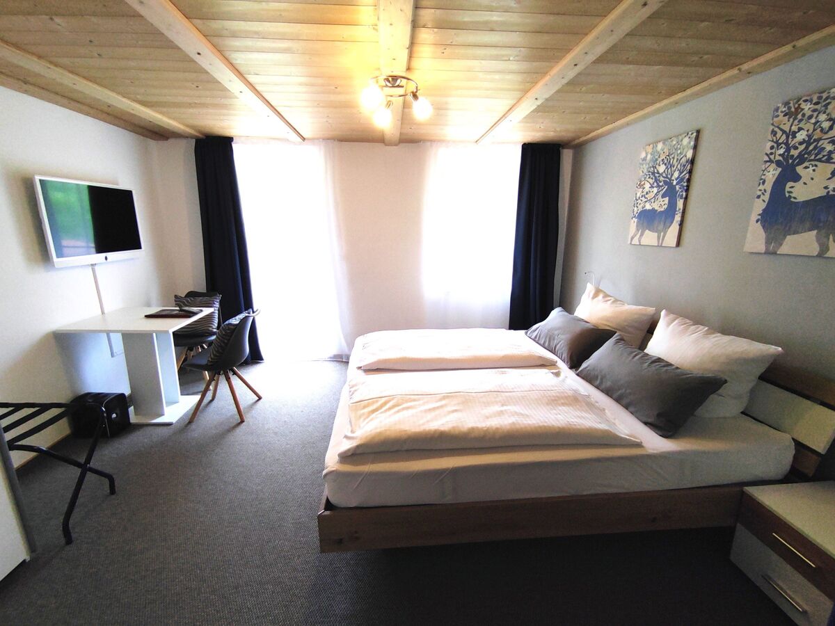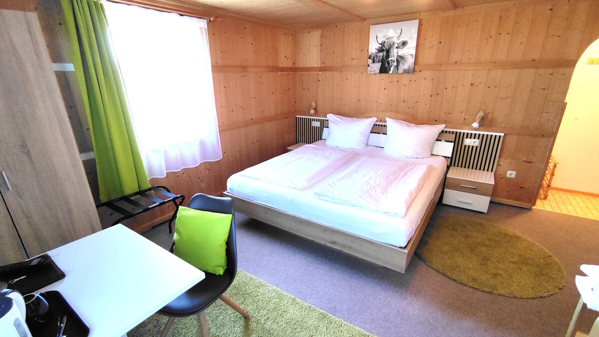 Die individuell möblierten, gemütlichen Doppelzimmer mit Fenster zum Garten/der Wiese und Bergblick, ohne Balkon, haben jeweils ein 180x200-cm-Bett mit offenem Fußende, einen Sitzbereich und einen eigenen Badbereich mit DU/WC.