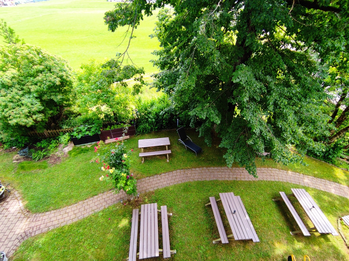 ein idyllischer, natürlicher Garten mit Picknicktischen und herrlichem Bergblick